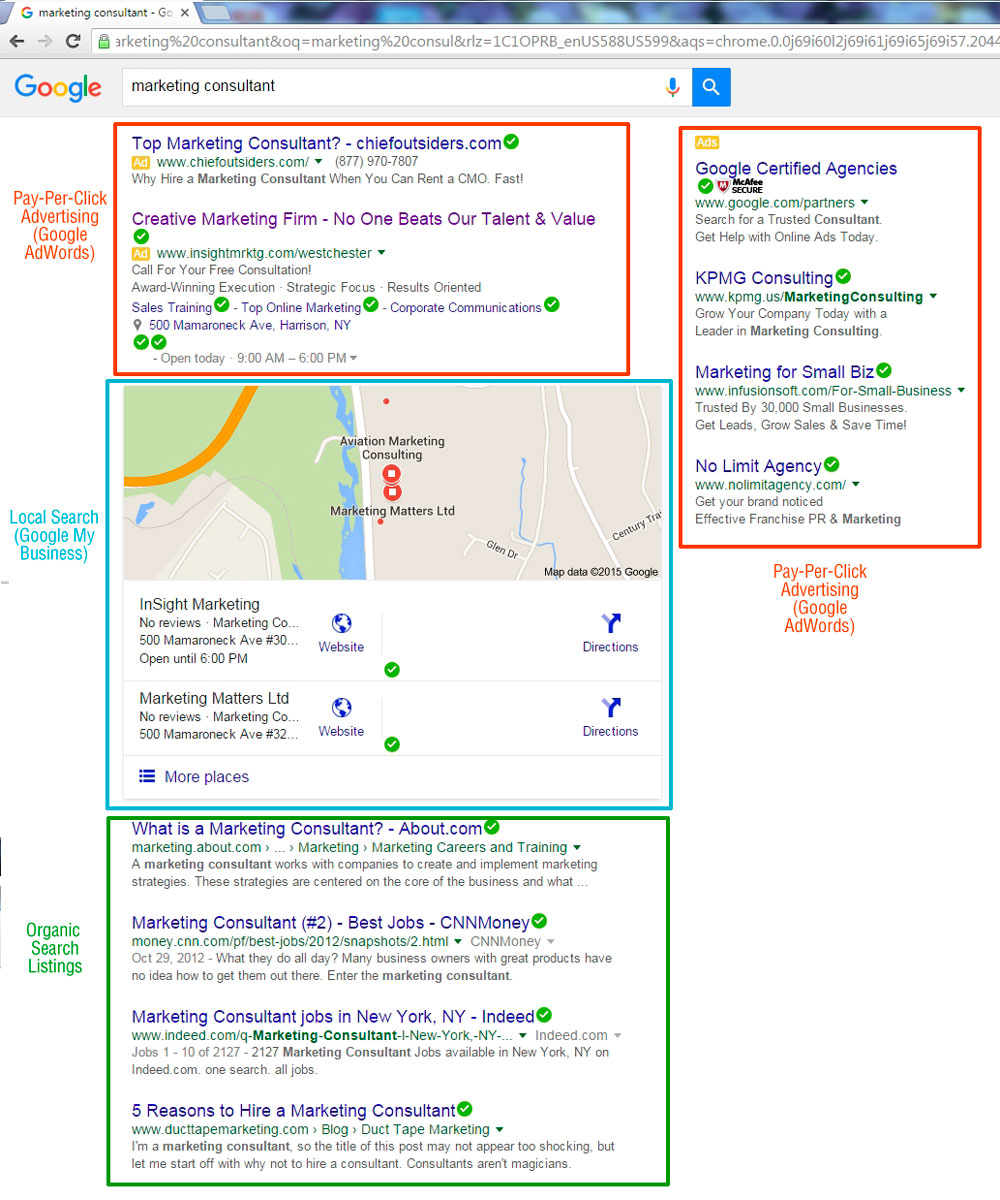 Some search results may look like business listings with results plotted on a Google map. These map-type results are called Google Places or Google My Business pages.